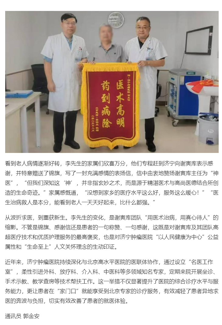 济宁肿瘤医院谢寅库团队获赠锦旗 为重病患者托起生命希望