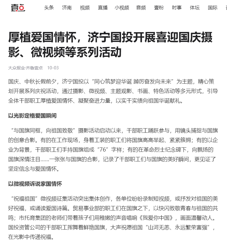 《齐鲁晚报·齐鲁壹点》| 厚植爱国情怀,大发(中国)开展喜迎国庆摄影、微视频等系列活动
